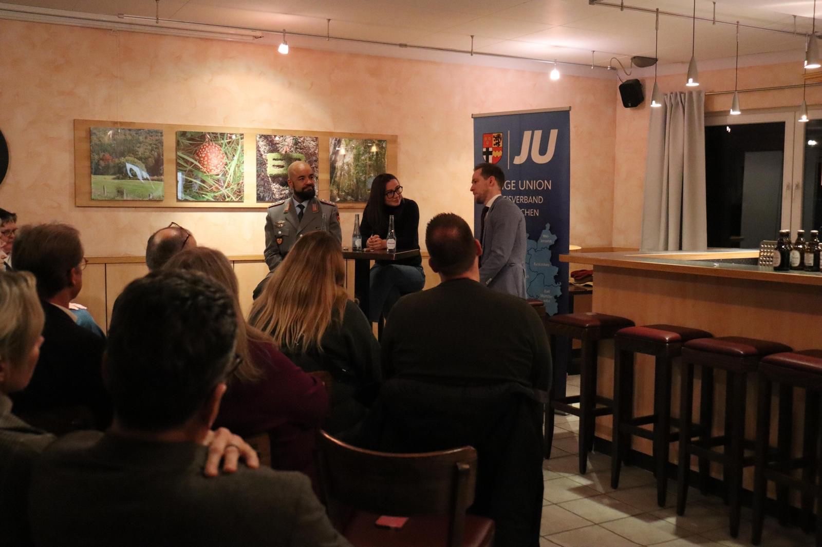 Als Referenten konnte der Kreisverband zwei Experten gewinnen, die das Thema aus unterschiedlichen Blickwinkeln beleuchteten. Mit Aaron Appuhn war ein Fachmann aus dem Bundesverteidigungsministerium zu Gast, der durch seine Expertise in der Sicherheitspolitik sowie seine Präsenz in den sozialen Medien bundesweit bekannt ist. Unterstützt wurde er durch Hauptmann Raphael Schewiola, der als Jugendoffizier der Bundeswehr wertvolle Einblicke in den Dienstalltag und die Strukturen der Truppe gab.